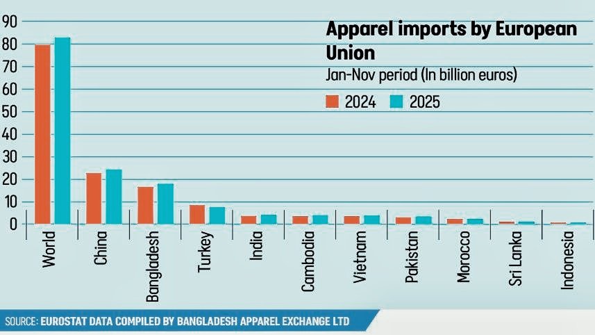 Bangladesh’s ready-made garment (RMG) exports to the European Union increased by 7.65% to €18.05 billion during January–November 2025, according to Eurostat. The growth comes amid shifting global trade patterns triggered by new US tariffs, which redirected garment shipments toward Europe.Despite the annual rise, exports declined 10.87% year-on-year in November, as garment unit prices fell by 3.25%, although export volumes increased 11.26%. Over the past year, unit prices dropped more than 12%, intensifying price competition in the EU market.Bangladesh remains the second-largest garment exporter to the EU, narrowing the gap with China. Meanwhile, exporters have urged the government to secure EU GSP Plus status ahead of Bangladesh’s LDC graduation in November, warning that losing duty-free access could significantly hurt export competitiveness.
