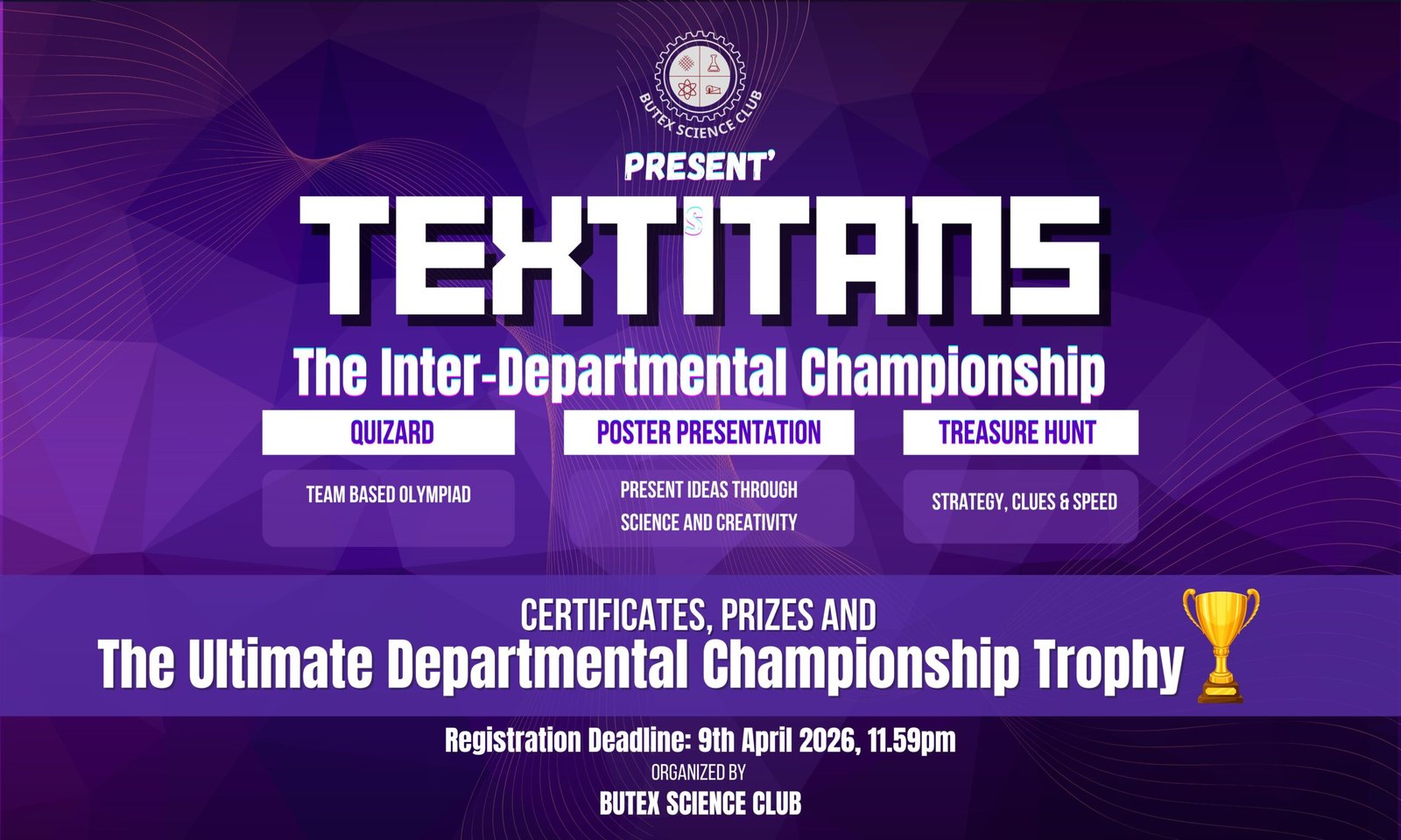 The BUTEX Science Club has officially announced TEXTITANS 2026: Inter-Departmental Championship, a flagship academic competition aimed at fostering engineering excellence through knowledge, strategy, and innovation.